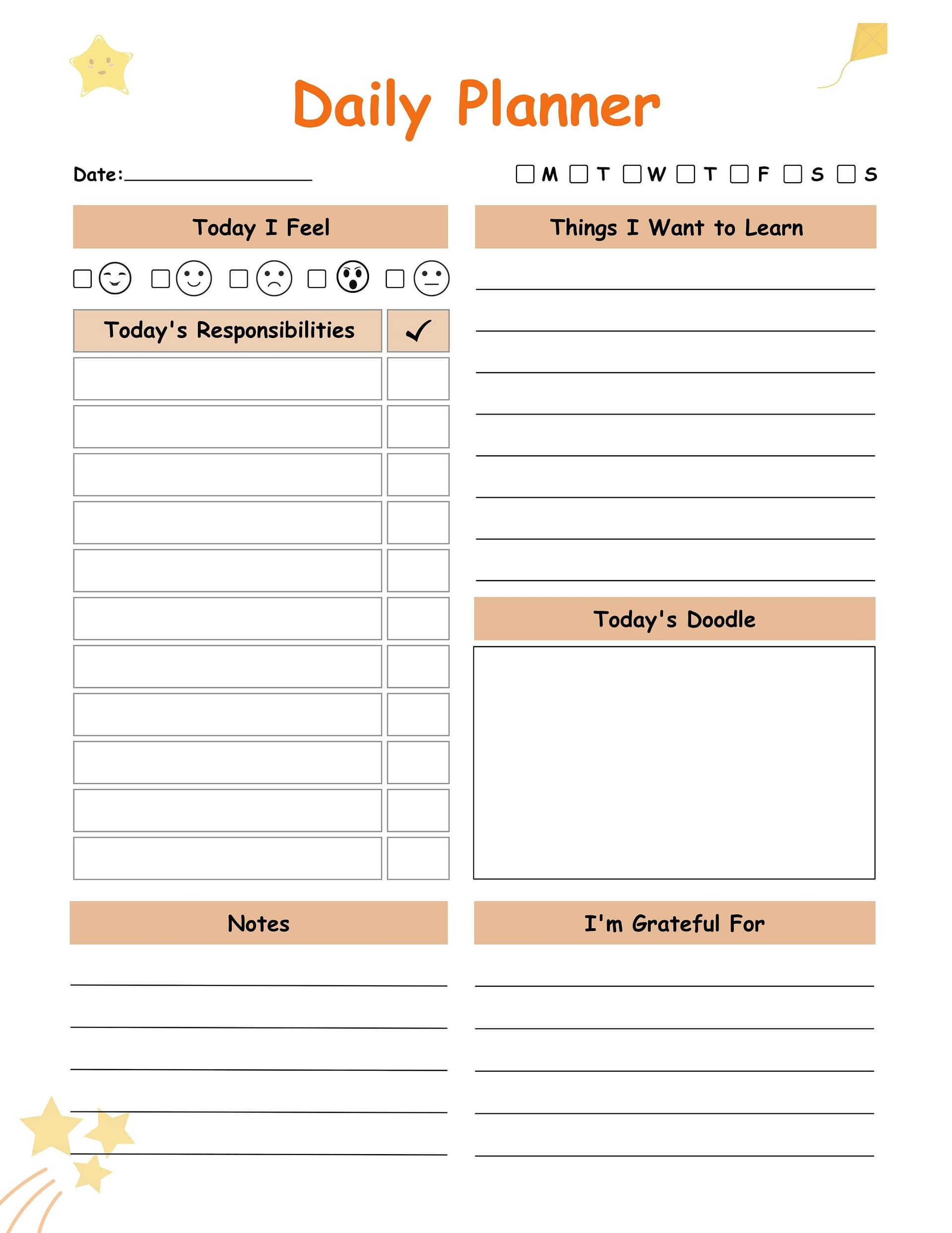 This 121-page printable daily planner helps children develop organization skills, emotional awareness, and positive habits. Each page includes: